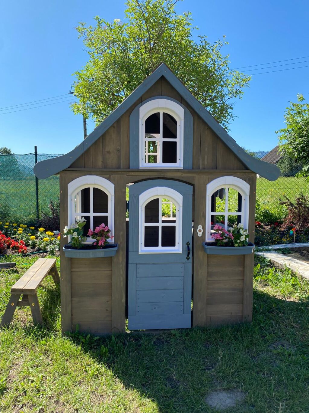 Sníte o poklidném místě, plném relaxu, zábavy a dobrého jídla? Pak jste na správném místě! V tomto rozkošném domečku se budete cítit jako v pohádce. Sněhově bílá okýnka zajišťují nepřetržitý přehled o svém okolí. Detaily jako hodiny, křídové tabulky a truhlíky na květiny přijdou jistě vhod. Útulná kuchyňka v podobě dřezu, vařiče a servírovacího pultu dává možnost malým gurmánům ukázat své kulinářské dovednosti. Díky lavičce se o své pochoutky můžete podělit se svými přáteli. Na co čekáte? Zazvoňte na funkční zvonek a zabydlete se! Ošetřeno základním nátěrem. Pro větší odolnost proti povětrnostním vlivům doporučujeme další ošetření dřevěných dílů.