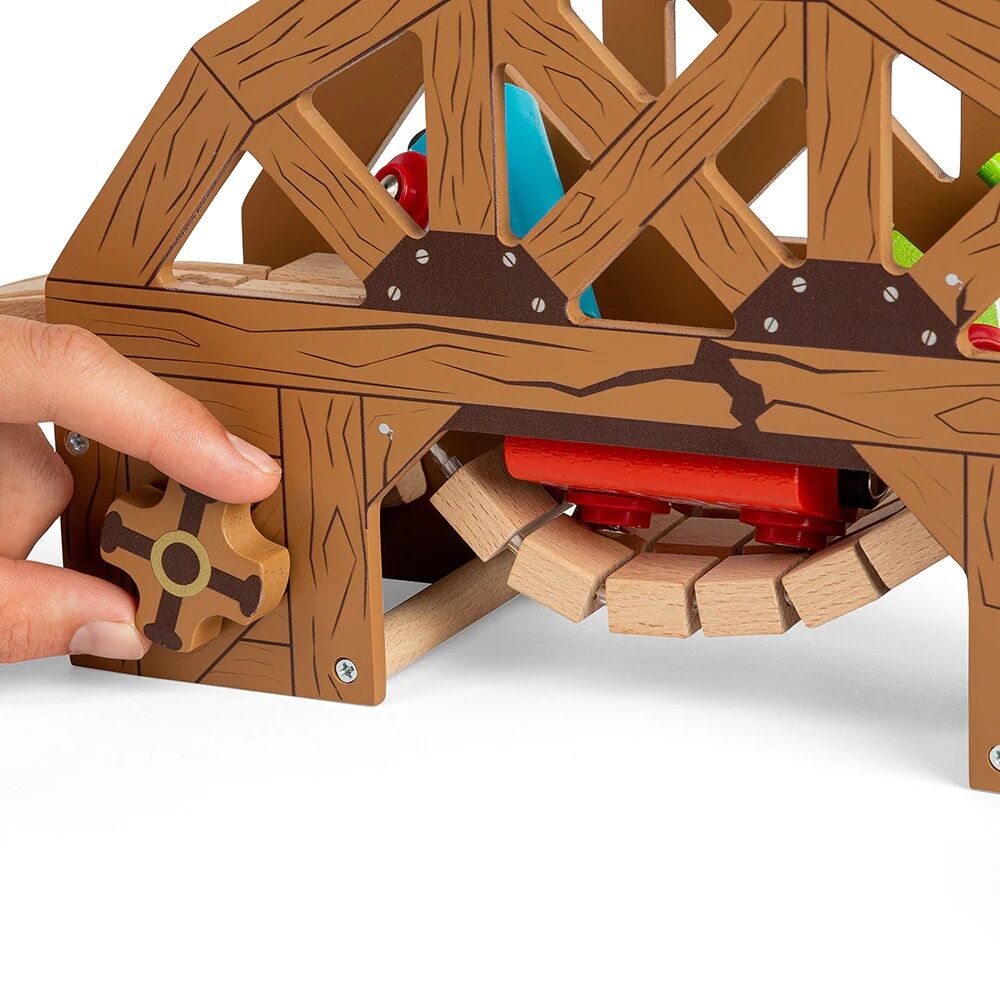 Kovbojové a kovbojky si užijí mnoho zábavy s tímto dřevěným mostem v tematice divokého západu. Vlaky vyjedou na most, ale dostanou se bezpečně na druhou stranu? Otočte kolem a most spadne! Interaktivní doplněk vláčkodráhy pro všechny vlakové nadšence. Hraní s vláčkem a otáčení kola rozvine dětskou motoriku a koordinaci ruka-oko. Obsahuje dva kusy stoupající a klesající koleje.