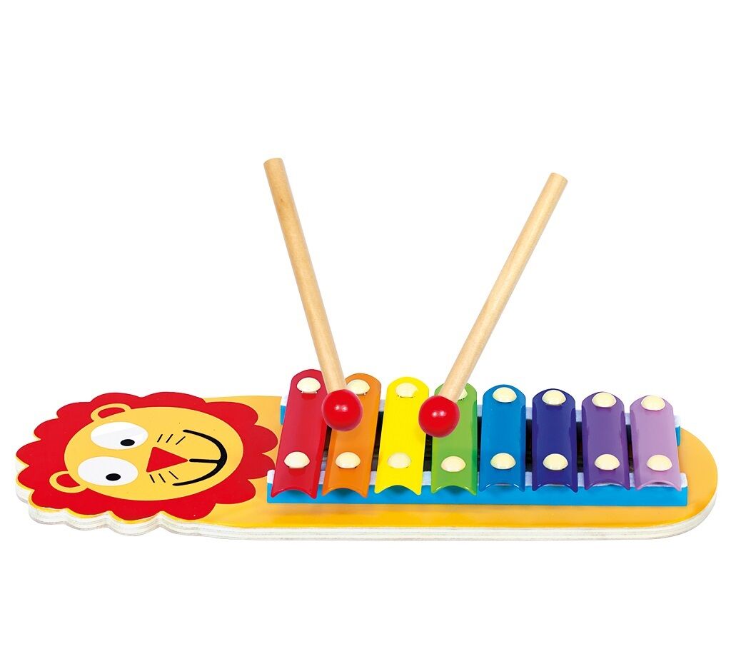 Dětský xylofon s motivem lvíčka. 3-dílná sada s 8 kovovými zvukovými pláty, které nabízejí hraní v plném rozsahu. Xylofon nabízí dětem příležitost seznámit se se základy hudby a rozvíjet svůj hudební talent. Je tak ideální hračkou pro první dětské hudební kroky. Ošetření nezávadnou barvou, zaoblené rohy a hladké povrchy zajišťují bezstarostné hudební chvilky. Vhodné pro děti od 18 měsíců. Varování! U dětí do 18 měsíců používat pouze pod dohledem dospělé osoby.
