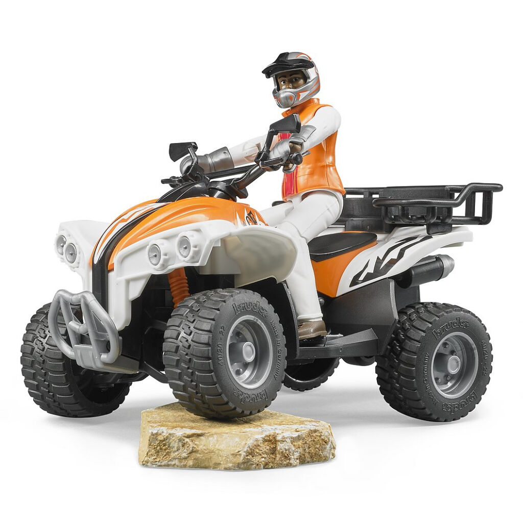 Přírůstkem do rodiny Bruder je pracovní čtyřkolka s řidičem. Čtyřkolka má pohyblivá kola, odnímatelnou část zavazadlového prostoru, odpruženou přední a zadní nápravu. Součástí čtyřkolky jsou 2 držáky pro nářadí. Vybavena je měkkými gumovými pneumatikami s běhounem. Řidič čtyřkolky má pohyblivé ruce, nohy a hlavu. Na sobě má jezdecké oblečení včetně helmy a jezdeckých bot. Model je reálnou kopií opravdové čtyřkolky. Nevhodné pro děti do 3 let. Vyrobeno v Německu, z kvalitních materiálů.