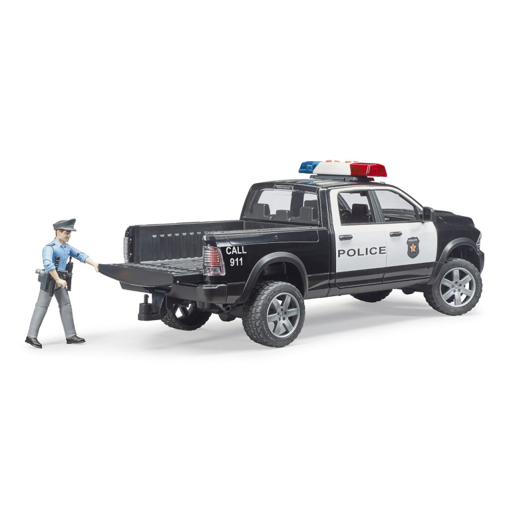 Policejní Pick-up s pohonem 4 x 4 se hodí do každého terénu, včetně méně přístupných lesů nebo horských oblastí. Terénní auto v barvách policie má světelný a zvukový maják, otevírací dveře a zadní čelo, nechybí ani zadní tažné zařízení a řiditelná přední náprava. Policejní auto RAM Bruder je možné řídit prodlouženým volantem, který je součástí balení. Místo za volantem je přizpůsobeno figurkám Bruder BWORLD.