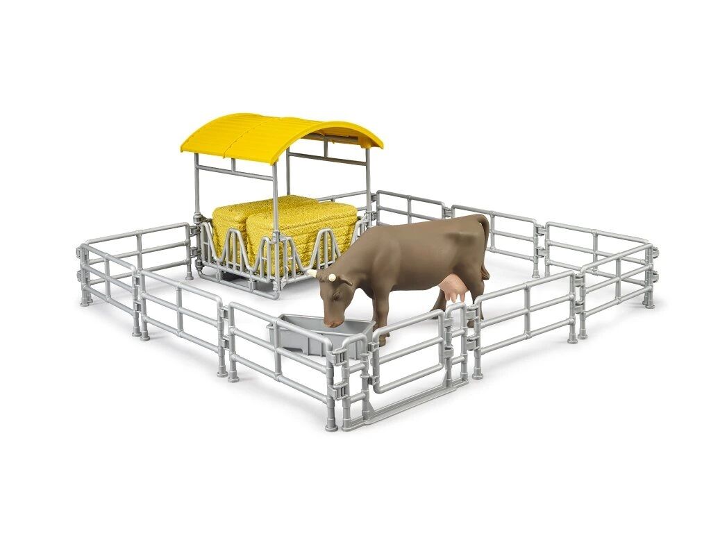 Součástí setu je seník s úložným prostorem na seno, ohrady pro vymezení prostoru a krmítko, které umožňuje realistickou hru při krmení zvířat. Nechybí ani figurka krávy, která dotváří autentickou farmářskou atmosféru. Jednotlivé prvky lze variabilně uspořádat a kombinovat s dalšími sety BRUDER, což rozšiřuje možnosti hry.