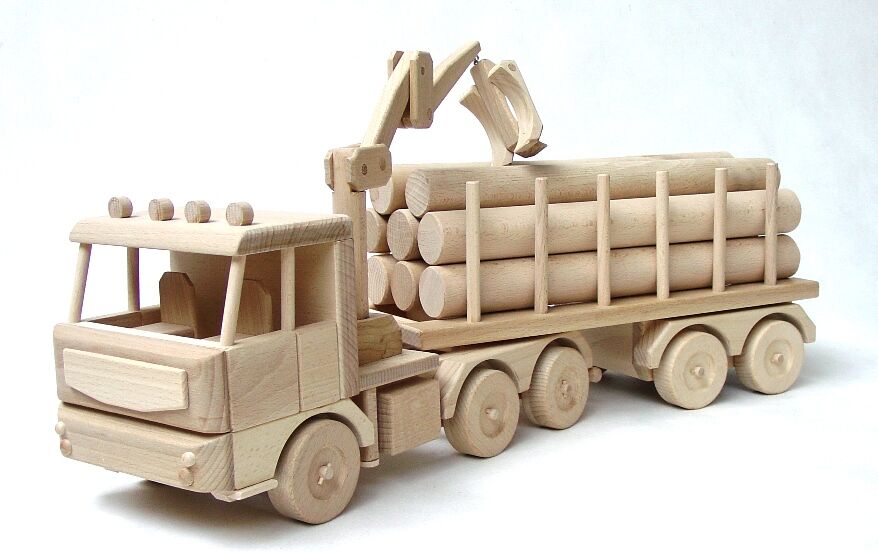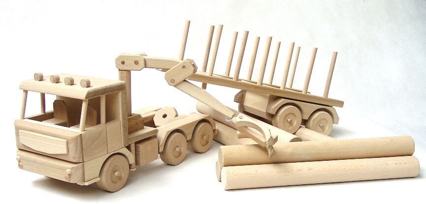 Rameno se hýbe, klády jsou odnímatelné. Dřívka jsou součástí, přívěs se vytáčí do stran, lze s tirákem zatáčet. Vyrobena z kvalitního tvrdého bukového dřeva, tudíž vydrží. Nádherně propracovány detaily.