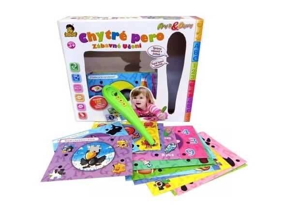 Chytré pero s kartami je interaktivní hra, která děti zaujme a zábavnou formou je mnohému naučí. S chytrým perem je učení snadné a zábavné. Pero vždy oznámí správnou odpověď rozsvícením zeleného světýlka nebo červeným světýlkem odpověď špatnou. Balení obsahuje 100 stran výukových kartiček - najdi číslo, najdi chybějící dílek, které písmeno chybí, kolik je na obrázku hodin..? Pero vydává zvukové efekty, světelná signalizace správné či špatné odpovědi, nastavení úrovně hlasitosti.