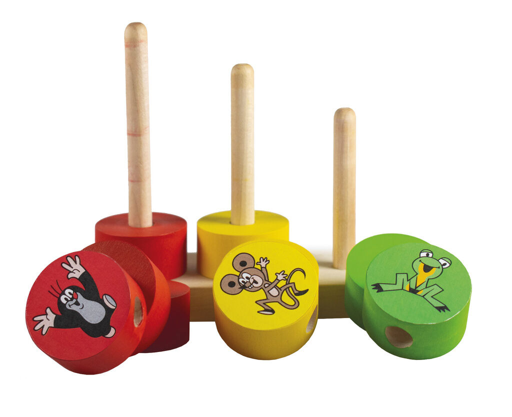 Veselé pyramidy se skládají z 12 navlékacích dílů a jednoho základního dílu se třemi tyčkami. Skládací pyramida pomáhá rozvíjet motoriku rukou a představivost dítěte.