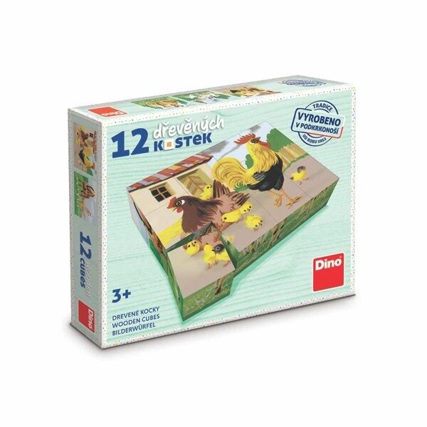 Dino Dřevěné obrázkové kostky Domáčí zvířátka retro 12 kostek