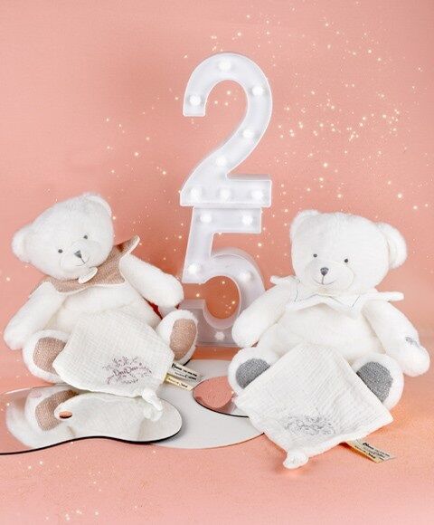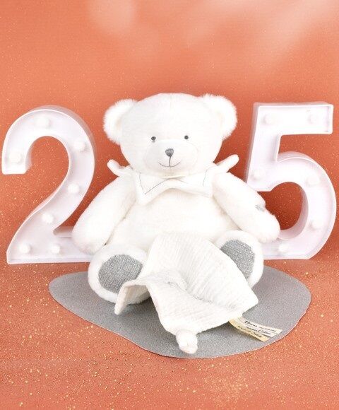 Plyšový medvídek je ideálním dárkem pro děti již od narození. Součástí medvídka je měkoučká dečka, která je skvělá k mazlení a může pomoci miminku snadněji usnout. Dečku lze jednoduše schovat do bříška medvídka, což je praktické při cestování nebo ukládání. Je ozdobená jemnou výšivkou značky Doudou a saténovými stuhami s láskyplnými vzkazy ve francouzštině, které dodávají každému mazlení ještě něžnější pocit. Medvídek má stylové šedé srdíčko na tlapce, roztomilý bílý límeček pod krkem a hebké šedé tlapky, které mu dodávají něžný a přátelský vzhled.