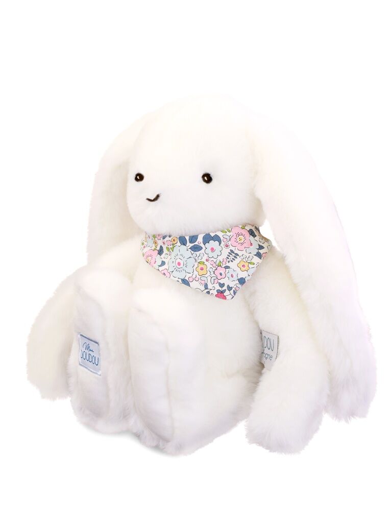 Heboučký bílý králíček o velikosti 35 cm s květovaným šátkem má přátelský obličej, dlouhá ouška a doprovází miminko od narození po celé dětství, aby mu přinesl pocit pohodlí a bezpečí. Díky barevnému provedení v jemných barvách a prémiovému hebkému materiálu vybízí k tulení a muchlání a dítě zabaví i uklidní. Přispívá k rozvoji smyslového vnímání, jemné motoriky a je roztomilým pomocníkem pro klidné usínání. Ideální dárek pro jakoukoliv příležitost.