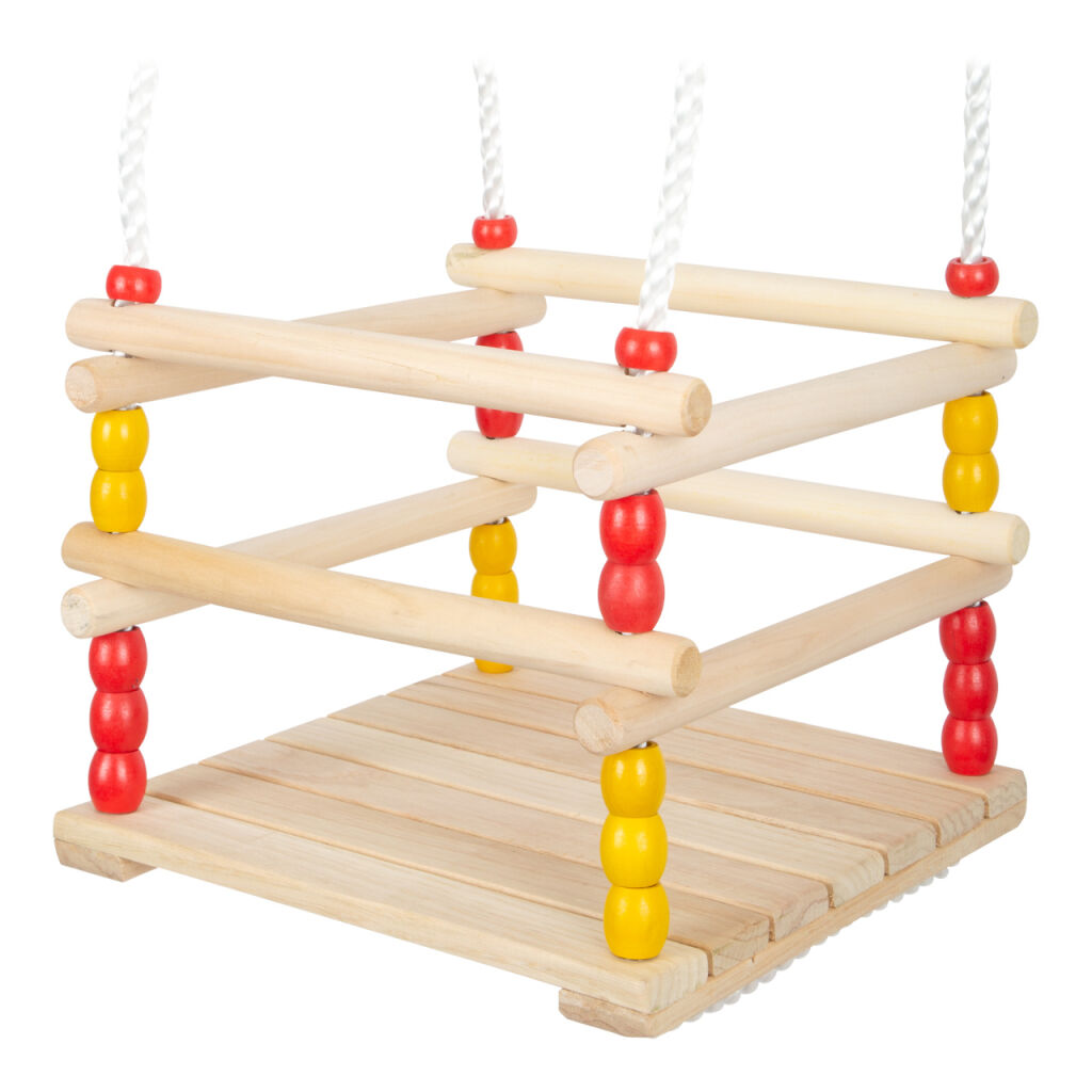 Dřevěná houpačka s hrazením, o které se děti mohou opřít a pevně se jej přichytit. Pevná plastová lana jsou na koncích opatřena kroužky k zavěšení a jejich délku lze pomocí kovových průvleků snadno nastavit. Houpačka je vyrobena z pečlivě opracovaného masivního dřeva a je dodávána ve složeném stavu, připravena k zavěšení.