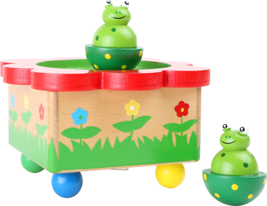 Co za píseň slýchám? Kdopak to tančí? Kvaky, kvak! Žabičky mají veselku a ty na ni nesmíš chybět! Malé žabky bezpečně drží na vrcholu dřevěné natahovací hrací skříňky pomocí magnetů. Lze je jednoduše oddělit a děti si s nimi mohou hrát na zemi, stole či postýlce. Díky snadnému ovládání mohou tuto hrací skříňku samostatně obsluhovat i děti.