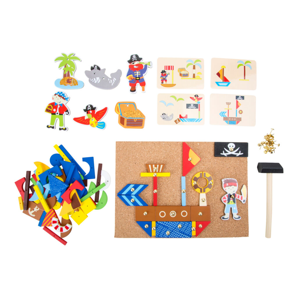 Klasická zatloukací hra s bohatým výběrem malých dřevěných dílků s motivem pirátů, včetně praktického dřevěného kladiva. Součástí jsou čtyři oboustranně potištěné karty s návrhy motivů. Dodává se se zlatými připínáčky, které lze snadno připevnit do pružného korku. Umožňuje vytvářet jedinečné tepané obrazy. Díky praktickému úložnému boxu se nic neztratí.
