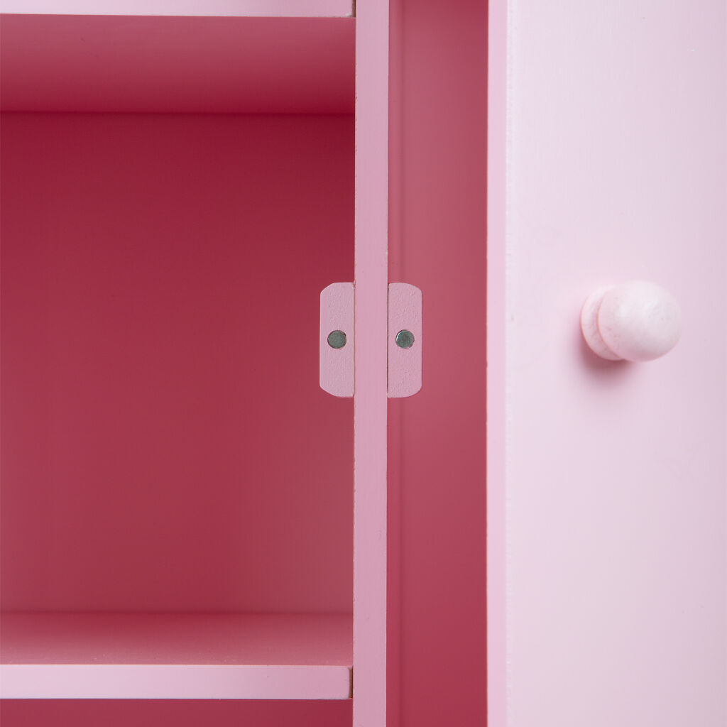 Lakovaná skříňka na kolečkách, se spoustou místa pro každý kousek z šatníku vašich panenek. Levá strana se skládá ze dvou poliček, zatímco pravá z prostoru pro zavěšení šatů. Na dveřích se nalézají dva motivy, hvězda a měsíc, jenž činí tuto skříňku ještě rozkošnější!
