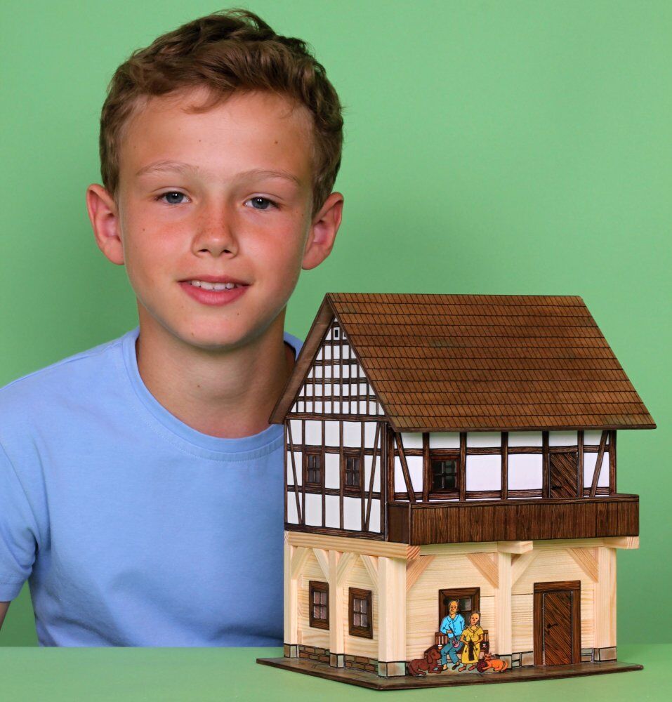 Dřevěná slepovací stavebnice obsahuje dřevěné hranolky daných délek ke stavbě roubených stěn, díly na střechy a štíty, kartonové výseky oken a dveří i předtištěné papírové potisky. Součástí stavebnice je schematický montážní plán.