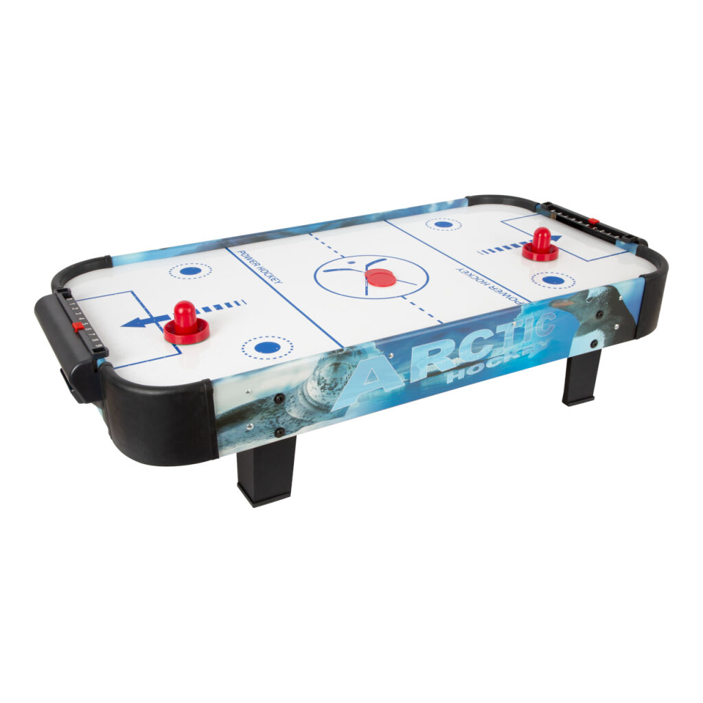 Populární vzdušný hokej prověří postřeh a hbitost dětí. Díky vzduchu vháněnému zespodu vestavěným ventilátorem může puk hladce, ale hlavně bleskurychle klouzat po hrací ploše. Hráči mají k dispozici kuželové pálky, kterými se snaží vstřelit puk do soupeřovy branky. Pálky jsou na spodních stranách opatřeny plstí pro snadný a bezhlučný pohyb. Branka každého z hráčů je vybavena jednoduchým číselníkem k zaznamenávání průběhu zápasu. Hru lze díky její velikosti snadno uklidit, přenášet, nebo i vzít na cesty. Napájení je zajištěno adaptérem se standardní eurozástrčkou pro 220–240 V. Výrobek vyžaduje montáž, dodáváno s obrázkovým návodem k sestavení.