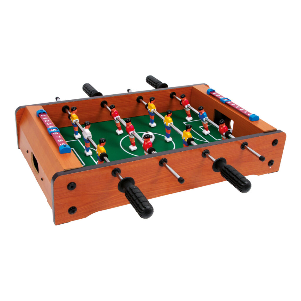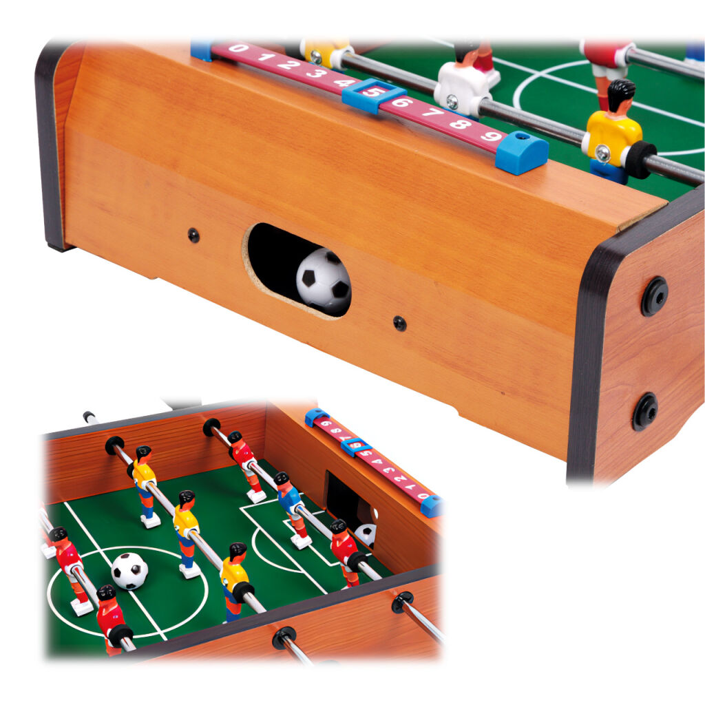 Tento malý stolní fotbal je zábavná hra. Každý tým má 6 hráčů. Na své si přijdou malí i velcí fotbaloví fanoušci. Rychlá hra trénuje koordinaci ruka-oko a přináší spoustu zábavy - takový je stolní fotbal. V balení najdete 2 ks míčků. Hračka je vyrobena z lakovaného dřeva. Fotbálek je vybaven počítadly gólů.