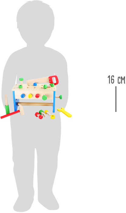 Můžete zde řezat, zatloukat a šroubovat. Tento barevný pracovní stůl se v mžiku promění v box na nářadí, a tak můžete veškeré nářadí ze světlého dřeva rychle uložit. Šroubovák, klíč, kladivo, pilu, šroubky a matky lze do boxu uložit a díky praktickému madlu je vzít všude s sebou. Co postavíme příště a kam to s sebou vezmeme?