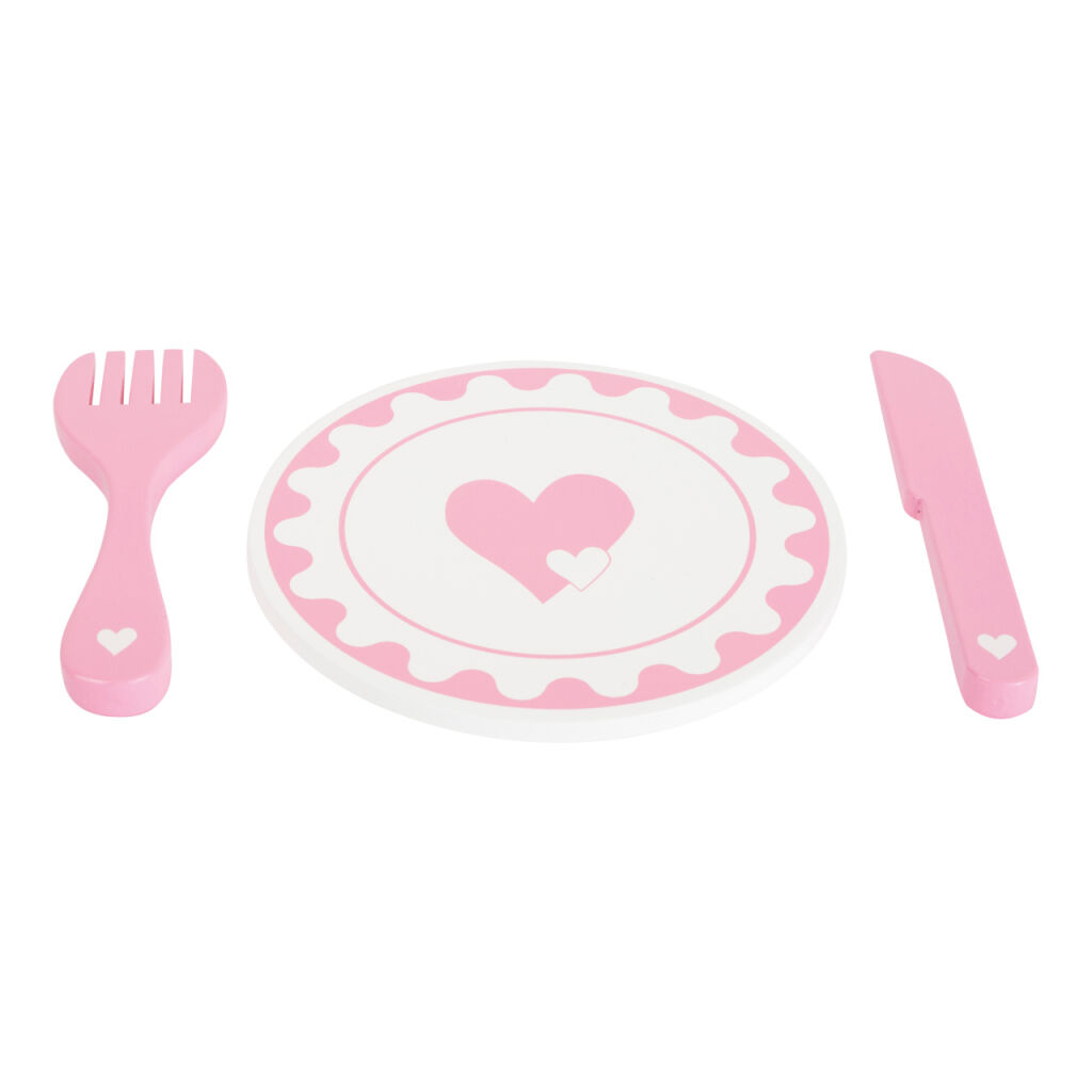 Pohádkové prostírání! Jídlo z dětské kuchyňky bude díky těmto talířům chutnat ještě lépe a děti se při hře mohou naučit správnému stolování. Malý dřevěný servis je dekorován srdíčky. Vyrobeno ze 100% certifikovaného FSC® dřeva.