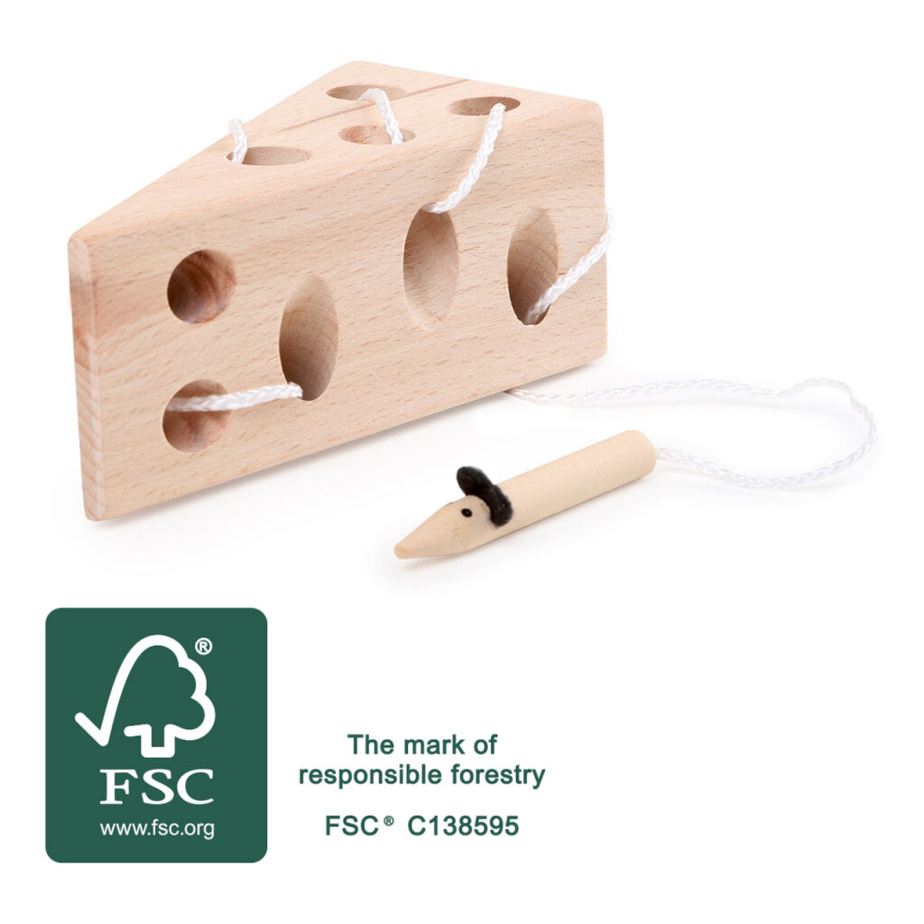 Kdo se to prokousal sýrem? Přeci malá myška! Tato krásná provlékací hra je vyrobena z přírodního lakovaného a 100% FSC certifikovaného bukového dřeva. Trénuje motoriku a trpělivost. S trochou zručnosti provlečete myšku hravě celým sýrem, procvičíte si prsty a jemnou motoriku.
