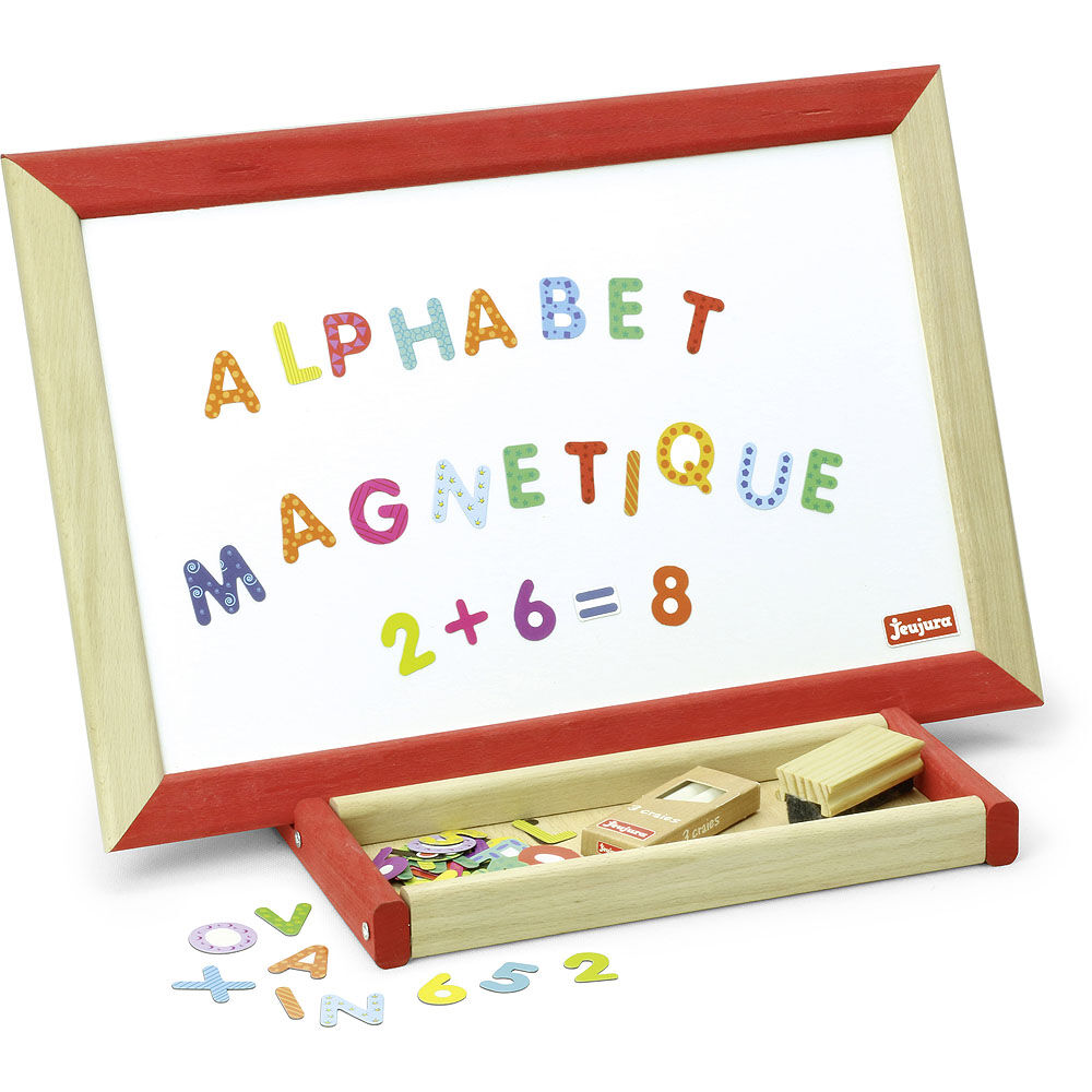 Stolní oboustranná magnetická tabule s dřevěnou základnou vybavenou odkládacím či úložným prostorem. Na černou tabuli se píše a kreslí křídou, bílou tabuli lze popisovat zvlášť určenými fixy a mazat plstěnou houbičkou. Vyrobeno ve Francii, z masivního bukového a borovicového dřeva francouzského původu. Součásti jsou ošetřeny výhradně za použití barev a laků na bázi vody. Baleno v kartonu potištěném rostlinnými inkousty. Součástí balení jsou křídy, houbička a sada vzorovaných magnetických písmen.