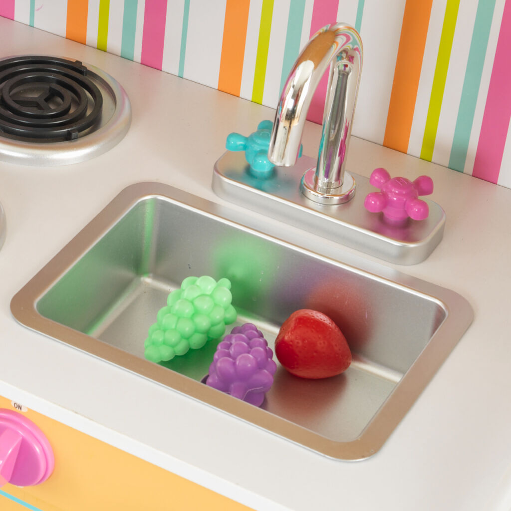 Vybarvěte si den! Prostorná kuchyňka v jasných barvách upoutá a inspiruje Vaše děti k rozmanitým hrám. Je vybavena dřezem, multifunkčním sporákem, chladničkou s mrazničkou, myčkou i mikrovlnnou troubou a nabízí také telefon nezbytný k organizaci domácnosti. V objemných prostorách za dvířky spotřebičů mohou nalézt své místo veškeré hračky a vhod při hře jistě příjdou také háčky k zavěšení náčiní. Dvířka trub jsou vybavena průhledy, a děti tak mohou svým výtvorům věnovat veškerou pozornost. Otočné knoflíky obsluhy spotřebičů vnáší do hry uvěřitelnost díky hmatové i zvukové odezvě v podobě cvakání. Výrobek vyžaduje montáž, dodáváno s detailním návodem k sestavení.