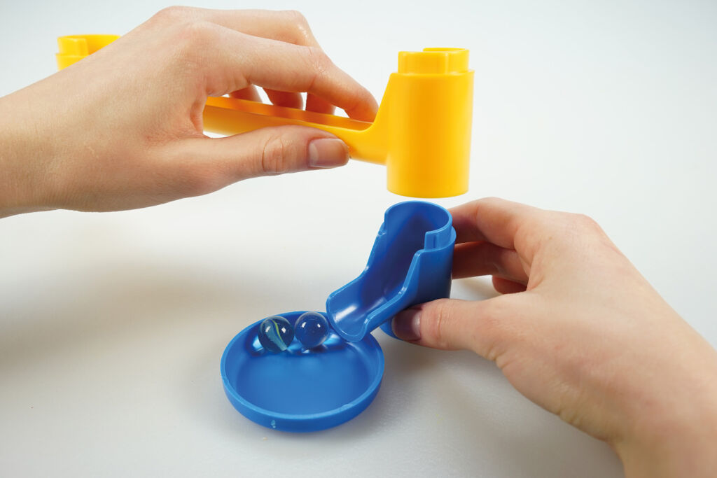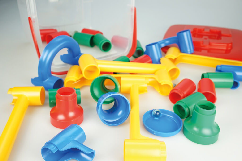 Barevná, plastová kuličková dráha v kyblíku. Obsahuje 29 dílů, 10 kuliček.