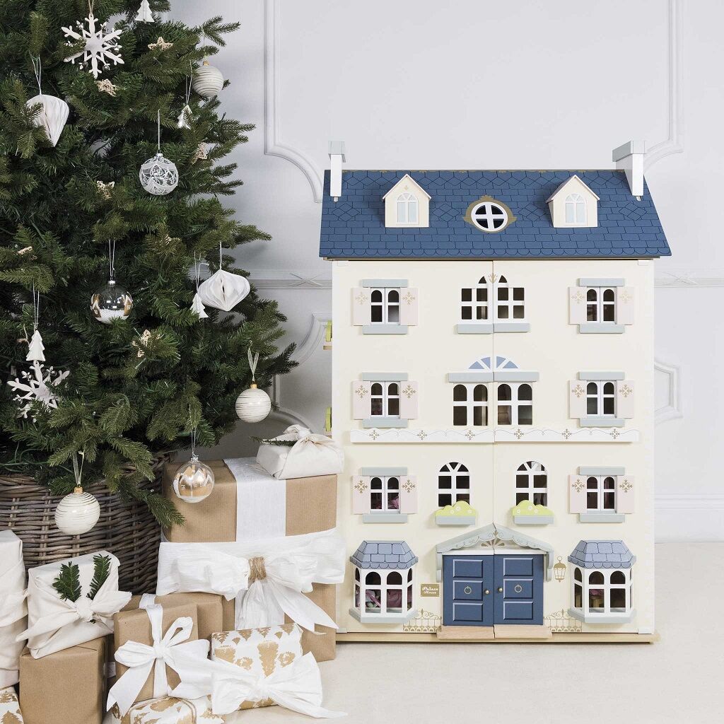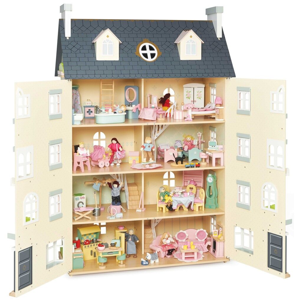 Uveďte děti do magického světa představivosti, vysoký domeček s pěti patry je malován v neutrálních tónech, detaily jsou zlaté. Na každé straně najdete mnoho oken, některá z nich jsou otevíratelná, stejně jako nádherné vstupní dveře v královské modři. Všech osm pokojů má na stěnách elegantní dekorace, velké schodiště sahá až do čtvrtého patra a najdete na něm krásné tradiční zdobení.