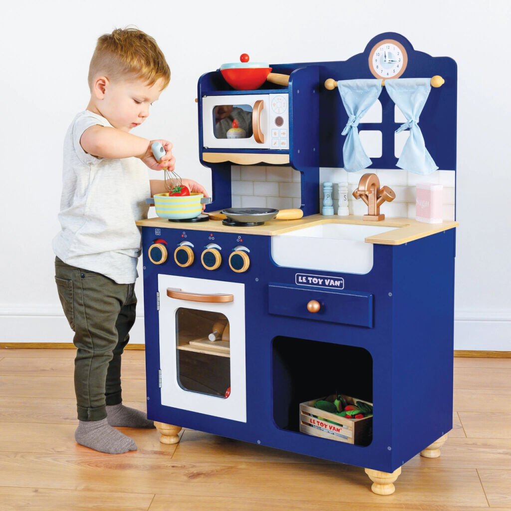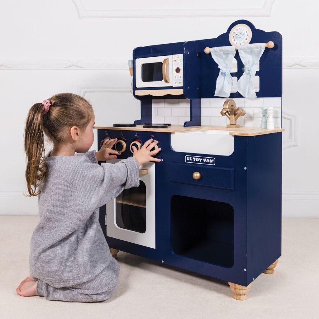 Kuchyňka Oxford je vyrobena z pevného a udržitelného dřeva, originální design z ní dělá unikátní kousek. Je malována v odstínu královské modři, její detaily jsou v barvě mědi. Tato tradiční hračka se bude hodit do každého dětského pokoje, děti nadchne k představivé hře na role. Mezi její funkce patří otevíratelné dveře trouby, otočné knoflíky, dřez, mikrovlnka, roztomilé okno se závěsy a hodiny s otočnými ručičkami. V balení najdete také metličku, vařečku, solničku a pepřenku. Vše pro malé šéfkuchaře a šéfkuchařky. Kuchyňku můžete dovybavit jídlem a doplňky z kolekce Honeybake od Le Toy Van. Krásná hračka, kterou si můžete předávat z generace na generaci.