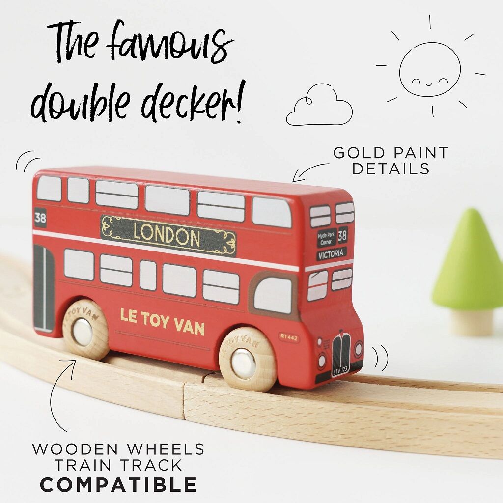 Vydejte se za dobrodružstvím s limitovanou edicí londýnského autobusu! Tato hračka z odolného dřeva je vyrobena a ručně očíslována ve Velké Británii - každý kus je zcela jedinečný! Lakovaný v tradiční červené barvě s elegantními zlatými detaily a robustními koly je kompatibilní se všemi garážemi a vláčkodráhami z řad Le Toy Van. Autobus je ze dřeva s certifikací FSC® (dřevo z lesů obhospodařovaných udržitelným způsobem) a ozdoben barvami na vodní bázi bezpečnými pro děti.