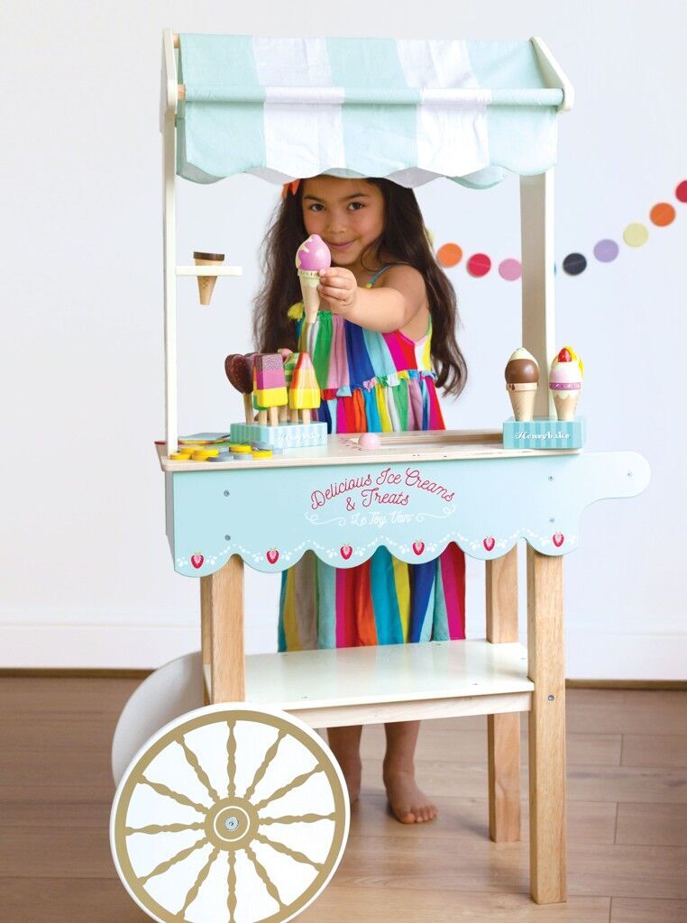 Letní občerstvení! Se stylovým zmrzlinovým vozíkem, který se v dnešní době vidí opravdu zřídkakdy, si děti mohou zahrát na zmrzlináře a zmrzlinářky. Retro zmrzlinový vozík je perfektní pro představivou hru v dětském pokoji i na zahradě. Klasický pruhovaný látkový baldachýn, pastelové barvy a zlaté detaily, tato skutečně jedinečná hračka je vyrobena z udržitelného dřeva a designována tak, aby vydržela mnoho let představivé hry. Má mnoho realistických funkcí, které mohou děti objevovat během hry. Přihrádku na led s posuvnými dveřmi, které odhalí ilustrace klasických příchutí zmrzliny, dva magnetické kornouty na zmrzlinu, pohyblivá kolečka, díky kterým budou moct zmrzlinu servírovat kdekoliv.