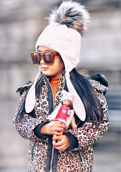 Panenka oblečená do béžového kabátku, růžového svetříku s kočičkou, kočičí čepičky, hnědých bot, sukénky a pruhovaných legínek. Kočičí brýle jsou skvělým doplňkem.