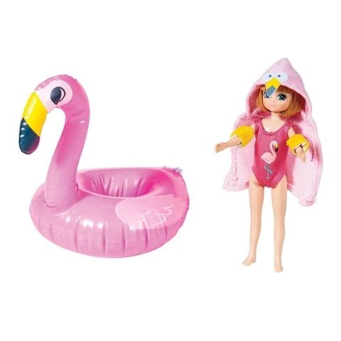 Rozkošná přenosná párty u bazénu. Lottie plavkyně, její rukávky, nafukovací plameňák a ručník s kapucí.