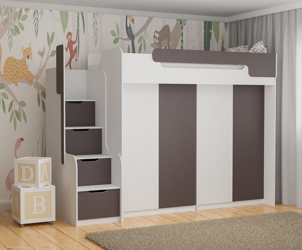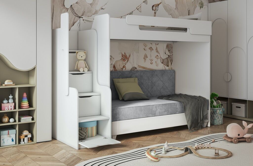 Dětská patrová postel DORIAN je moderní postel se schody a úložným prostorem.
