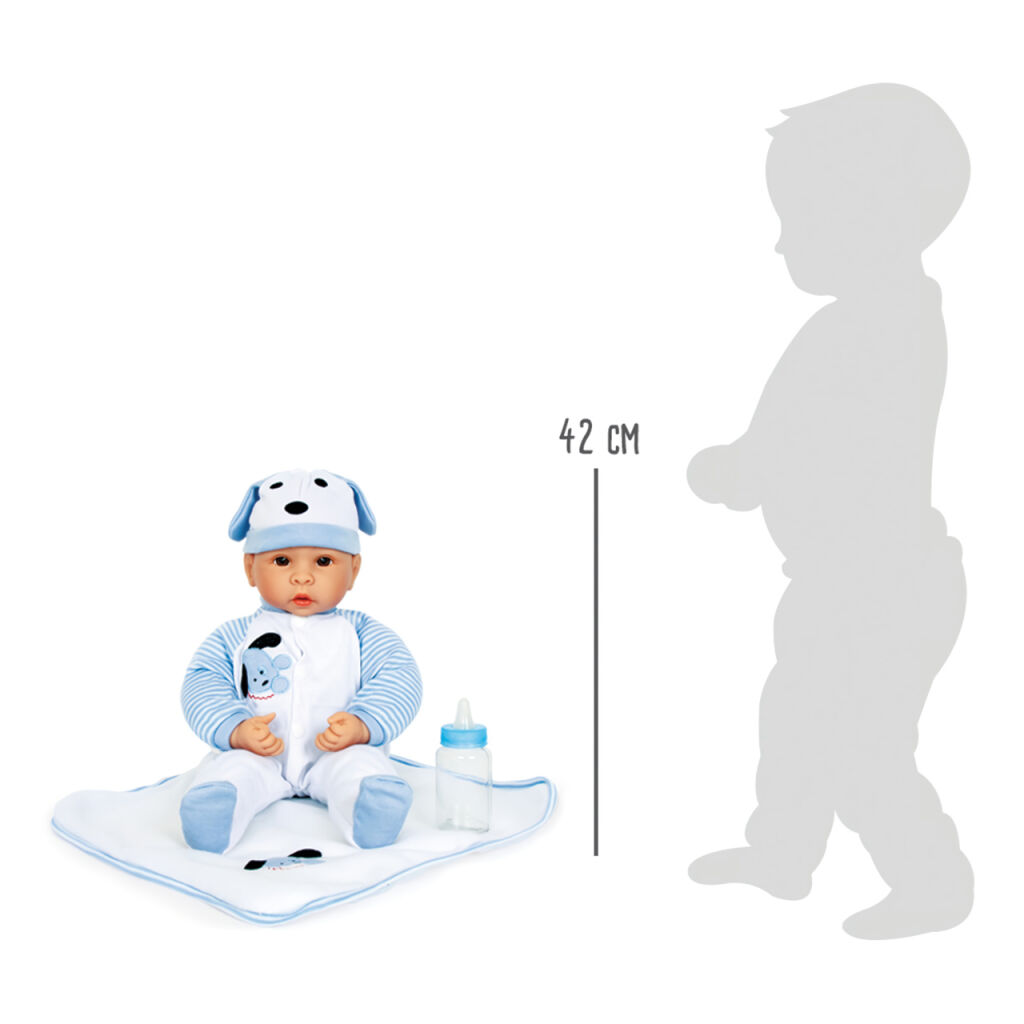 Malý Beno je velký milovník psů. Panenka má nasazenou čepičku a dupačky s roztomilým modro-bílým motivem štěněte. Balení zahrnuje kojeneckou lahvičku, dudlík, který se dá vložit do pusy, a měkkou přikrývku.