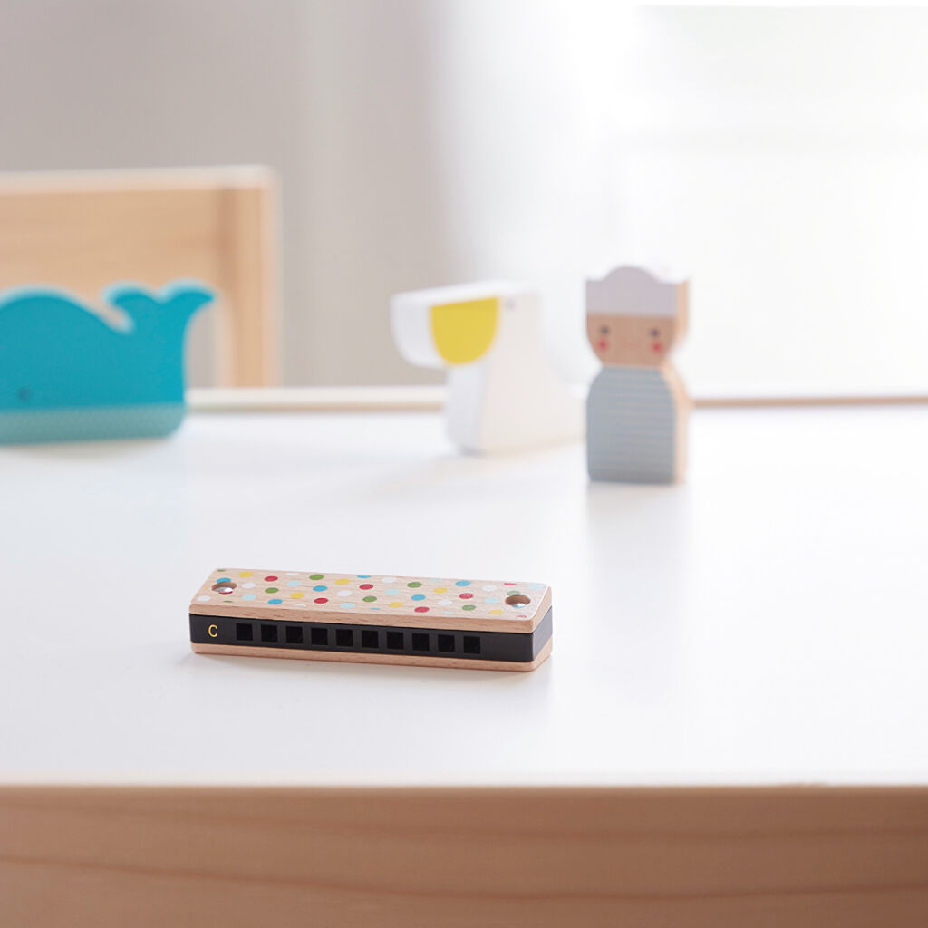 Povzbuďte svého malého hudebníka veselou harmonikou. Zdobená pestrobarevnými pruhy a puntíky, upoutá dětskou pozornost. Součástí balení je list s návodem ke hře, se kterým Vaši ratolest naučíte hrát co nevidět, a může Vás tak brzy překvapit vlastní honky-tonky melodií. Vyrobeno z udržitelně získaného dřeva.