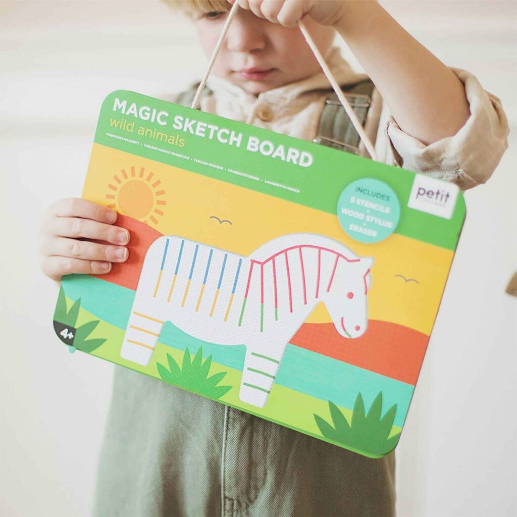 Rozprouděte představivost dětí s touto magnetickou kreslící tabulkou! Perfektní kreativní hračka domů i na cesty, má magickou tužku, která je připevněna k tabulce provázkem. Dále zde najdete mízítko a 5 ks předlohy pro kreslení. Když zrovna nekreslíte, můžete předlohy uložit do kapsy tabulky. Přiložte mizítko z druhé strany tabulky a rychle vymažte své umělecké dílo – můžete začít kreslit něco nového. Vyrobeno za použití recyklovaných materiálů, natištěno barvami na bázi zeleniny. Vhodné od 4 let. Neobsahuje BPA, ftaláty, olovo ani formaldehyd. Tolerance několika nemazatelných bodů.