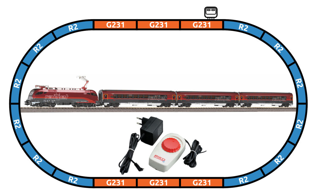 Startovací sada soupravy Railjet skládající se z elektrické lokomotivy Taurus, třech osobních vozů různých tříd, prodlouženého oválu a analogového ovládání s napájením. Lokomotivu lze dovybavit digitálním dekodérem. V naší nabídce naleznete také další vagony odpovídajícího typu a úpravy. Koleje s podložím zajišťují vyšší odolnost a životnost při opakovaném rozebírání. Nákup sady je vhodné doplnit o příslušný spotřební materiál.