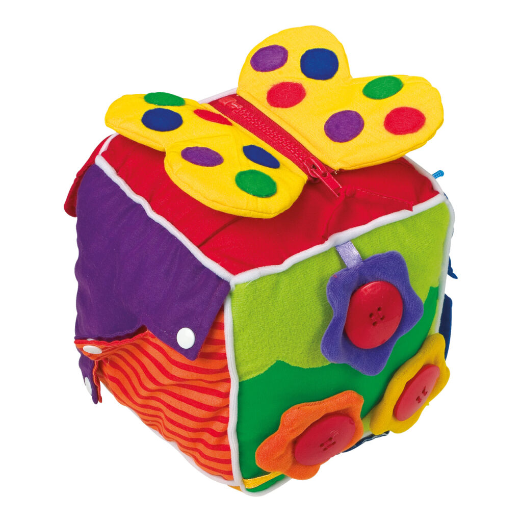 Plyšová kostka s různými zapínáními pro motorická cvičení dětských prstů. Každý typ zapínámí se nachází na jiné straně kostky - šněrování, knoflíky, na zip, na patentky, na suchý zip a pomocí nylonových tkaniček.