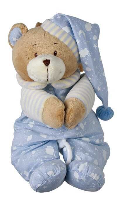 Už žádné noční můry! Medvídek v modrém pyžamku přeje sladké sny! Tělíčko má z měkkého materiálu a na tváři veliký úsměv. Po hodinách zábavy a hraní Vám pomůže usnout za ukolébavky „Dobrý večer, dobrou noc“. Méďa je ten pravý kamarád, ve štychu Vás nenechá! Pro možnost zavěšení jsou na hlavičce našité 2 měkké pásky.