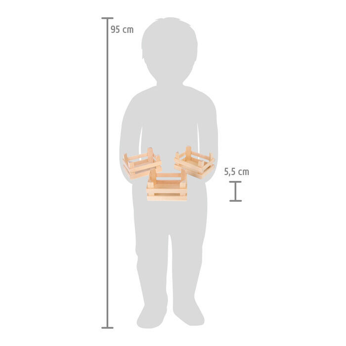 Pevné a odolné dřevěné bedničky jsou všestranně využitelné. Lze jimi doplnit některý z široké nabídky stánků ke hrám na prodavače, stejně tak ale mohou posloužit k třídění a udržování pořádku, ať už v dětském pokoji, nebo na zahradě. Díky přírodní úpravě je můžete natřít a nalakovat dle své fantazie a potřeb.
