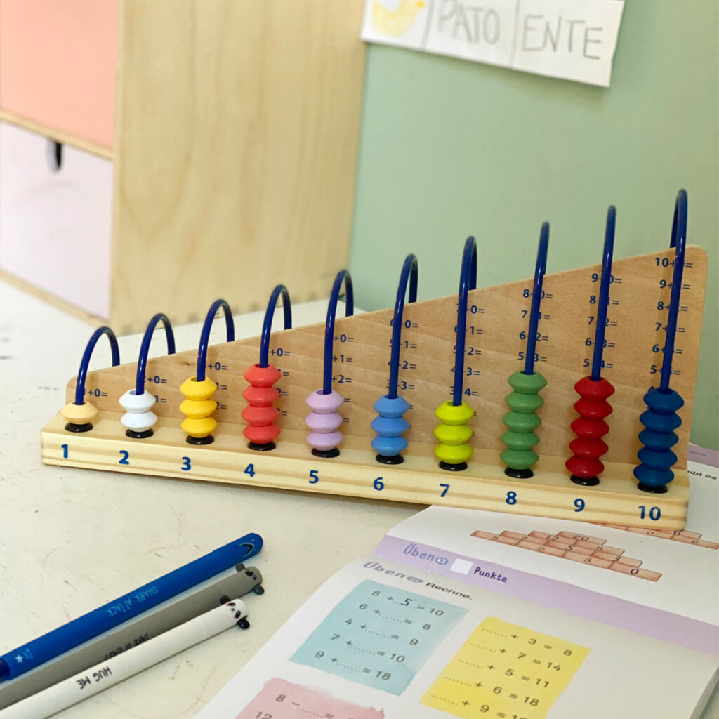 Dřevěné korálky na desíti kovových vesele malovaných obloucích, funguje jako vizuální pomůcka pro výpočty. Na vnitřní dřevěné stěně je 55 matematických příkladů z každé strany. Příklady odčítání a sčítání mohou děti lehce vypočíst pomocí dřevěných korálků! Kvalitní dřevěné počítadlo.