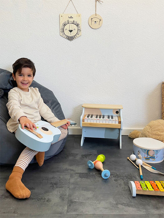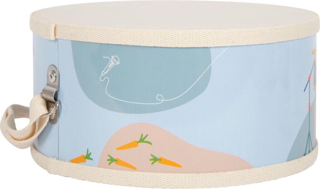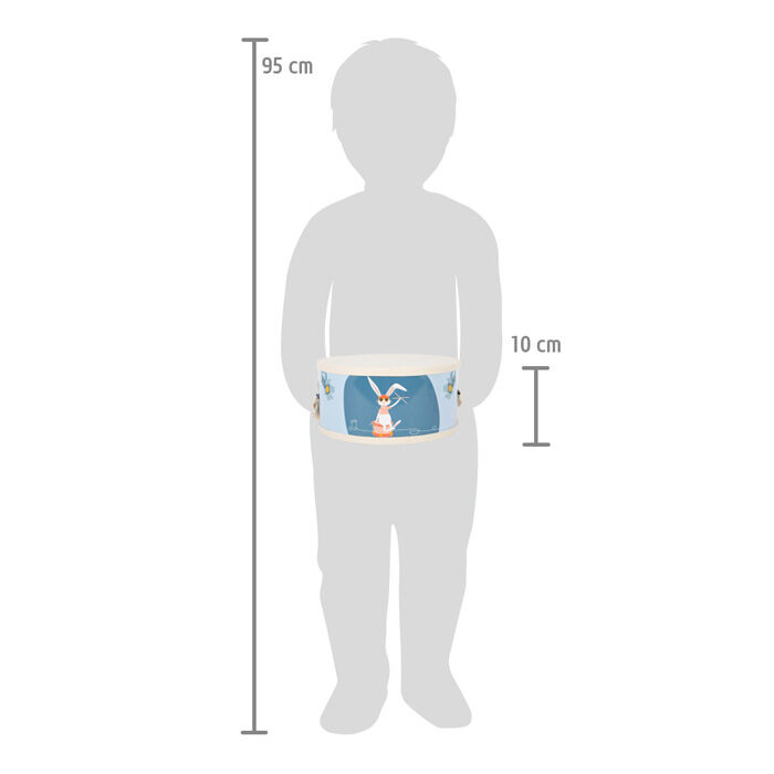S tímto dětským bubnem budou dobře vybaveni všichni mladí, začínající bubeníci, protože spolu s oblíbeným zajícem má co nabídnout uším publika! Bavlněný pásek bubnu lze nastavit na libovolnou délku pomocí kovové přezky. Paličky jsou opatřeny zvukově tlumicími kryty, aby to v dětském pokoji nebylo příliš hlučné. Díky kombinaci přírodního dřeva a moderních kontrastních barev je to absolutní hit pro mladé hudebníky! Tento dětský bubínek hravě trénuje smysl pro rytmus a rytmiku a také koordinaci ruka-oko. Je ideální pro ranou hudební výchovu!
