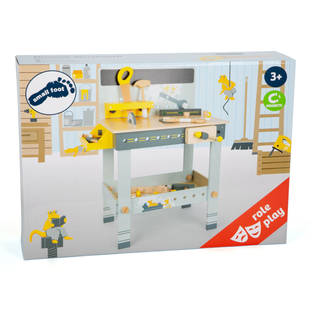 Řezání pilkou, otáčení šrouby, zabíjení kladivem! Společně s roztomilými Miniwoby si děti otestují svou zručnost a jemnou motoriku. Na ponku najdete vybavení jako 1 kotoučová pila, 1 elektrický šroubovák s 3 nástavci, 1 vodováha, 1 svěrák, 1 kladivo, 1 klíč, 1 pilka, 2 krabice s otvory pro šrouby, 6 stavebních lišet, 16 šroubů, 16 matek, 3 hřebíky. Děti si mohou svůj projekt načrtnout na tabuli, své nářadí uložit do malých boxů, které mohou zavěsit z boku ponku. Děti vám dokonce mohou pomoci se složením ponku! Minimalistické barvy, mnoho viditelného dřeva, prostě perfektní hračka pro malé kutily a kutilky.