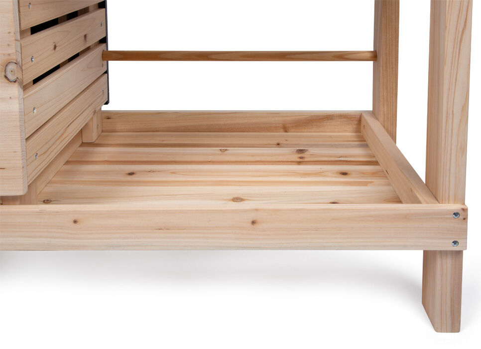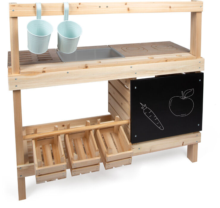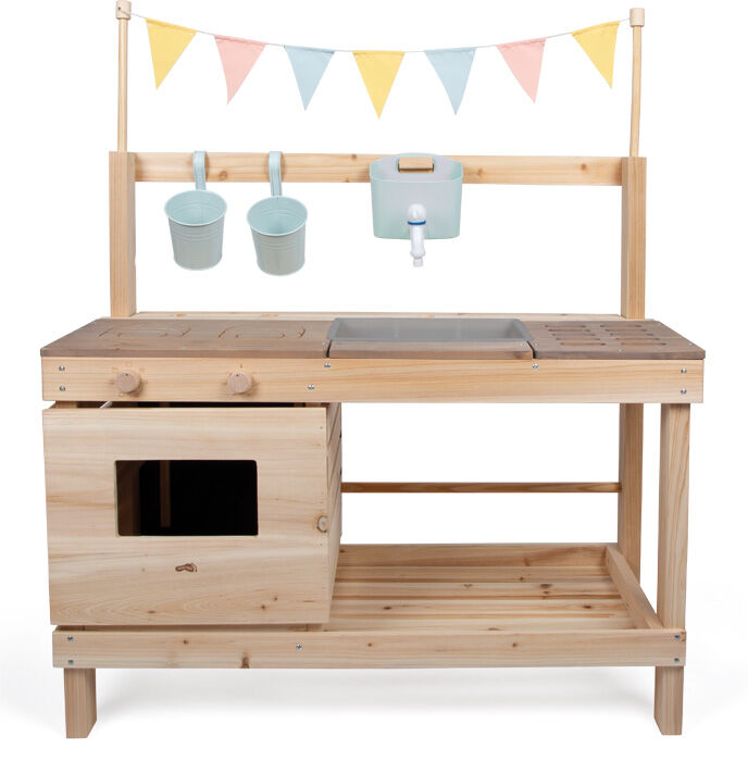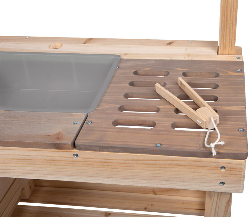 Tato vysoce kvalitní, extra velká venkovní dětská kuchyňka se stánkem z masivního dřeva nabízí jedinečný zážitek z hraní venku. Je přístupná z obou stran a vybavená množstvím doplňků – z jedné strany slouží jako kuchyňka pro vaření, míchání a experimentování s vodou či hlínou, z druhé strany jako obchod nebo dílna, která podporuje kreativní hraní na nakupování a prodej. Mezi hlavní prvky patří trouba s otočnými knoflíky a výsuvným plechem, varná deska s gravírovanými symboly a designem dotykového ovládání a dřez s dávkovačem vody a kohoutkem. Nechybí ani grilovací plocha, tři dřevěné bedýnky, závěsné květináče, police, kovové nádobí, kuchyňské doplňky a také dekorativní vlaječka, která dodává celé kuchyňce jedinečný vzhled. Součástí je i křídová tabule, boční háčky, dostatek úložného prostoru a kontrastní pracovní deska. Praktické otvory na ukládání herního náčiní pomáhají udržet pořádek. Tato multifunkční venkovní kuchyňka a obchod zaujme nejen svým propracovaným designem a vodními prvky, ale i kvalitním zpracováním. Ať už ji děti využijí jako kuchyňku, dílnu nebo obchůdek, přirozeně rozvíjí jejich motoriku, jazykové dovednosti i sociální schopnosti při hraní rolí a poskytuje hodiny zábavy. Pro zachování dlouhé životnosti doporučujeme neošetřené dřevo pravidelně ošetřit ochranným nátěrem.