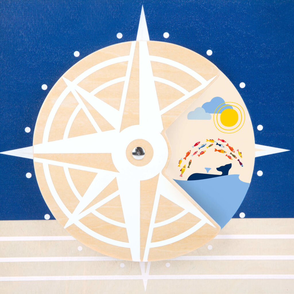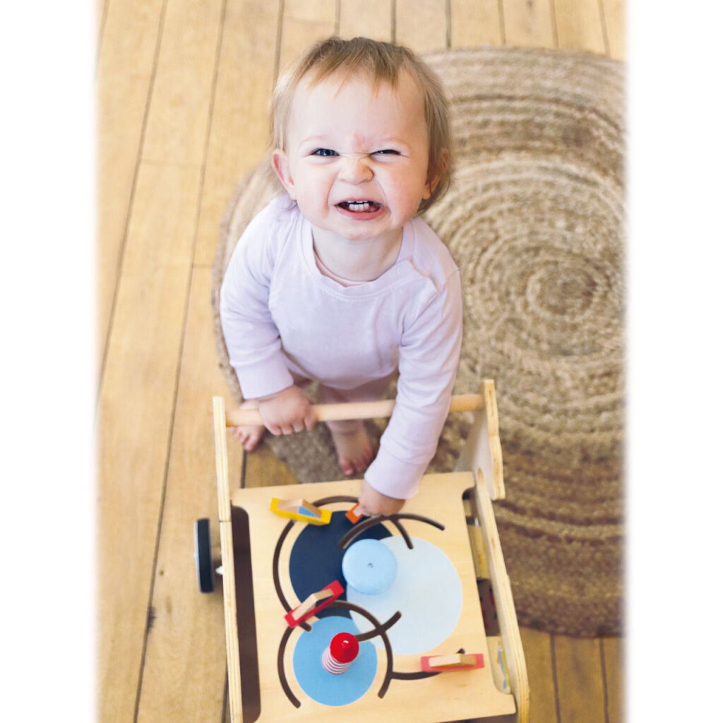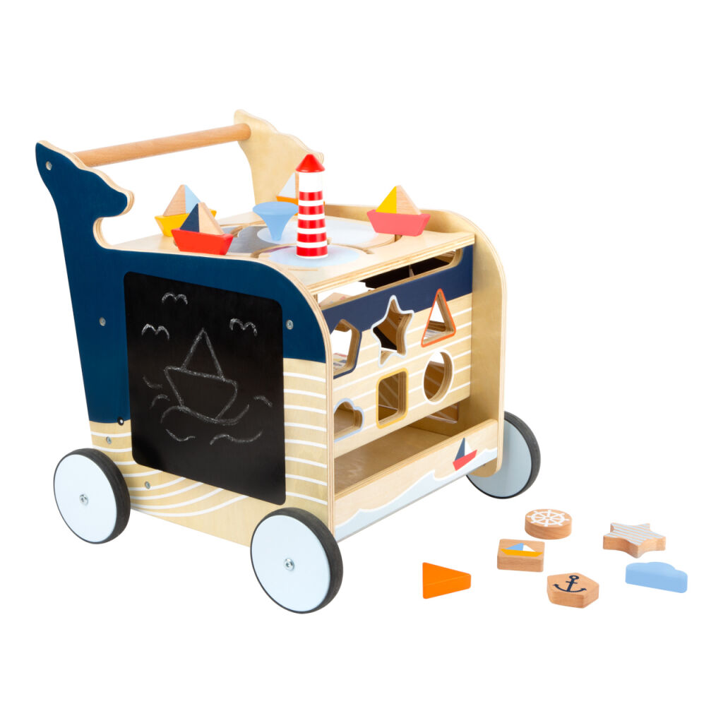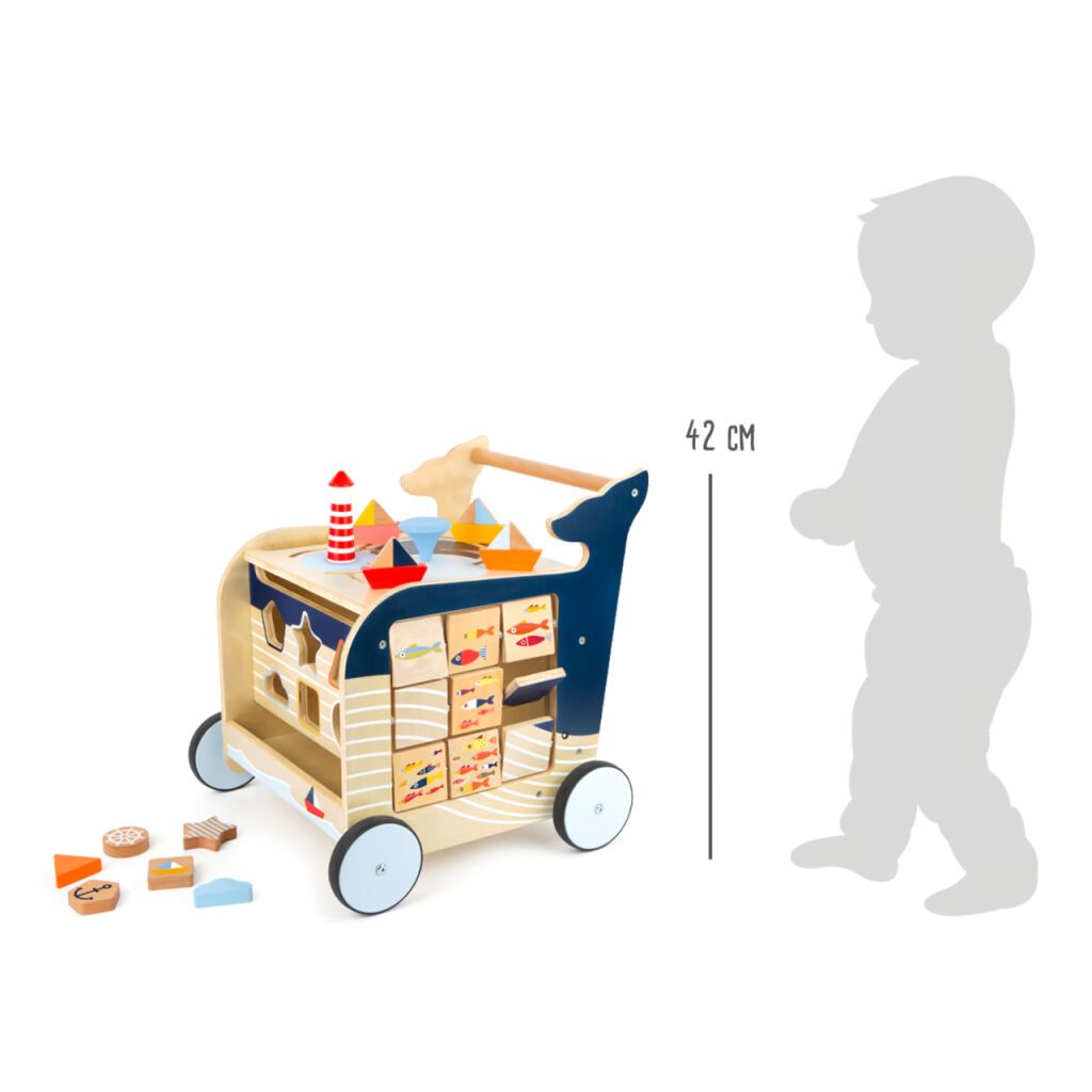 Pojďme na průzkum s velrybou! Toto dřevěné chodítko ve tvaru velryby pomůže dětem s prvními kroky a zároveň nabídne hračky k rozvoji motoriky. Chodítko se drží stylu mořského světa a jeho živočichů. Na čtyřech stranách chodítka naleznete hry jako vkládání tvarů, otáčení obrázků nebo kreslící tabulku. Děti se mohou naučit počítat, určovat světové strany nebo rozlišovat roční období. Chodítko má pogumovaná kola a je tak tiché a zároveň bezpečné. Chodítko je nahoře otevíratelné a dvířka obsahují pojistku proti přivření prstů. Můžete do něj tedy uložit všechny kostky. Najdete zde i brzdný systém, který zabrání nehodám.