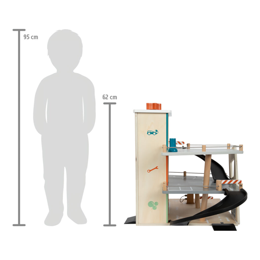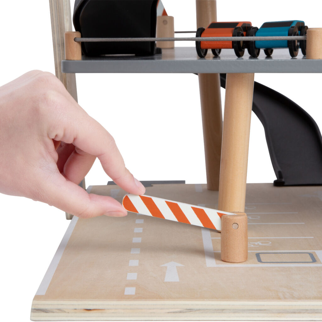 Parkujte, tankujte, myjte nebo opravujte, a to vše s jednou garáží! Nabízí tři bohatě vybavená podlaží propojená atraktivním funkčním výtahem a zábavnými, na sebe plynule navazujícími rampami. Její součástí je dvojice autíček, která mohou při fantastických hrách využít pumpy, nabíjecí stanice, zvedací rampy, nebo myčky s realistickými kartáči. Každá z úrovní je navíc opatřena mechanickou závorou pro dokonale poutavé zážitky. Patra jsou opatřena gumovým hrazením, které dodávají jízdě autíček na dynamice a brání jejich vypadnutí. Garáž je podrobně zdobena mnoha barevnými ikonami a značením, které do her vnese i poučení. Je vyrobena ze silné, pevné a odolné dřevěné překližky s doplňky z masivního dřeva a nezávadného plastu. Výrobek vyžaduje montáž, dodáváno s obrázkovým návodem k sestavení.