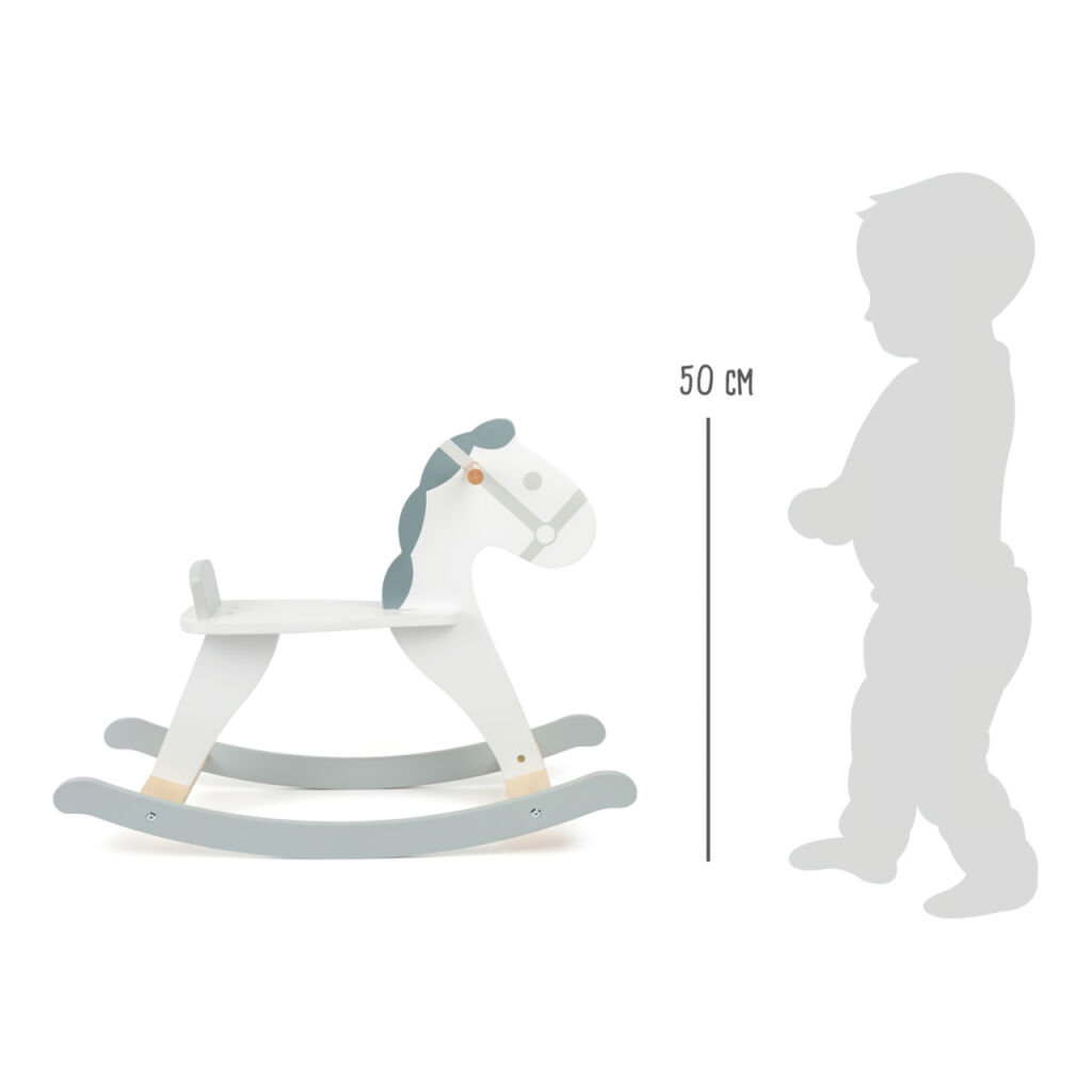 Klasická hračka, která by neměla chybět v žádném dětském pokoji. Přivětivými tvary láká děti k houpavým projižďkám, kterými mohou zesílit a zdokonalovat koordinaci pohybu nebo smysl pro rovnováhu. Pro větší bezpečnost a jisté sezení je sedadlo koníka opatřeno pevnou opěrkou. Díky minimalistickému skandinávskému designu kombinujícímu bílou a šedou barvu vkusně doplní moderní interiér. Konstrukce ze silné překližky a masivního dřeva zajišťuje dlouhotrvající zábavu. Výrobek vyžaduje montáž, dodáváno s obrázkovým návodem k sestavení.