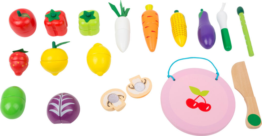 Tato směs ovoce a zeleniny má co nabídnout. Různé druhy ovoce a zeleniny jsou malovány tak, aby vypadaly jako skutečná potravina. Jednotlivé části drží pohromadě díky suchého zipu (kromě jarní cibulky a chřestu). Nůž na krájení hraček a dřevěná deska jsou součástí. Je to chutný zážitek z hraní, který podporuje také kreativitu a fantazii. Vše může být bezpečně uloženo v praktickém válcovém obalu z pevné lepenky. Tato sada je ideálním doplňkem dětských kuchyněk a prodejen.