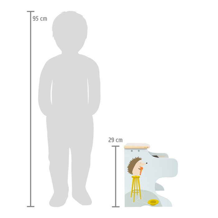 Kdo bude hrát na klavír? Toto robustní elektrické dřevěné piano dělá skvělý dojem díky jedinečnému designu. Díky kombinaci spousty přírodního dřeva, moderních modrých tónů a dětských motivů je tento klavír také absolutním poutačem pro oči v dětském pokoji! Přiložené samolepky, které lze nalepit na klávesy, podporují mladé hudebníky při jejich prvních skladbách. Dodává se s notami. Absolutní hit pro mladé pianisty! Toto dětské piano podporuje porozumění tónům, trénuje hudební povědomí a trénuje smysl pro rytmus a rytmiku. Ideální pro ranou hudební výchovu! Baterie nejsou součástí balení. Pozor, tento klavír je imitace, ne hudební nástroj, proto nemá profesionální zvuk.