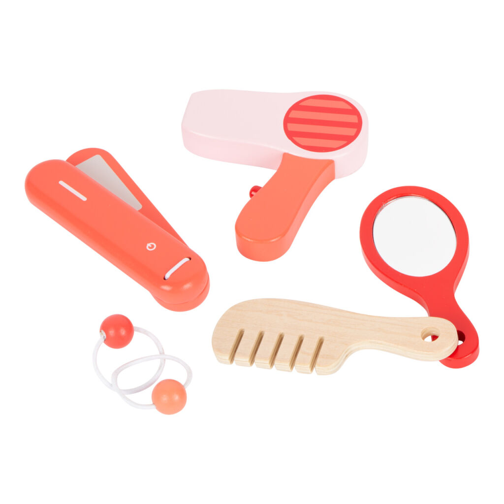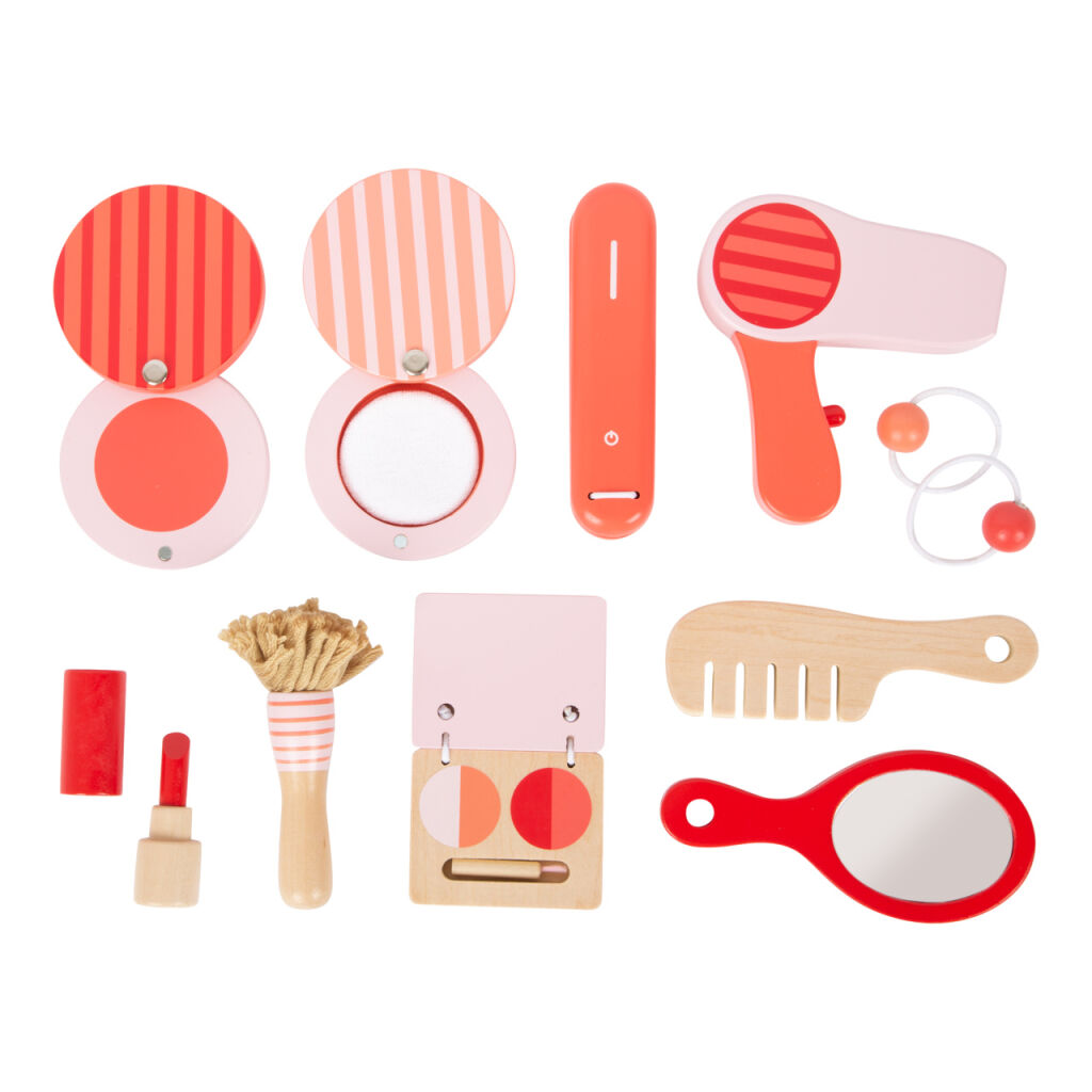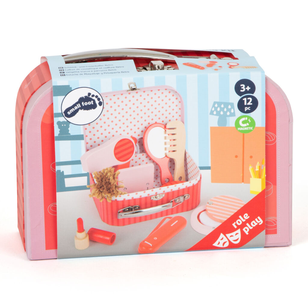 Make-up umělci a umělkyně, toto je pro vás! Kosmetický kufřík vyrobený ze dřeva je perfektní pro hraní na role. Obsáhlý set se skládá z hřebenu, zrcátka, fénu, rtěnky, pudru, očních stínů, žehličky na vlasy a také gumiček. Konečně se můžete namalovat jako maminka! Kufřík má zámek, všechny doplňky se do něj vejdou pohodlně. Kdo si nechá upravit vlasy jako první?