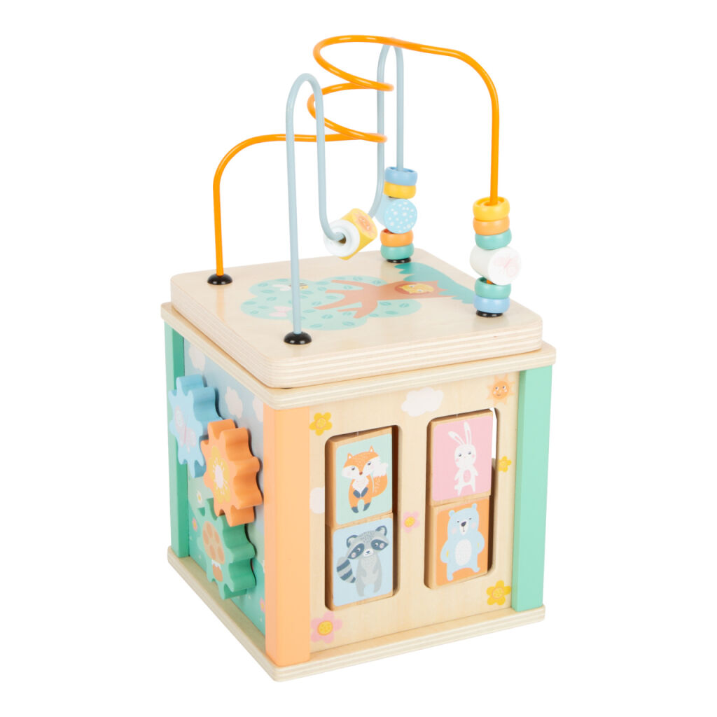 Skládejte, strkejte, klapejte, otáčejte! Můžete si hrát ze všech pěti stran! Dřevěná motoriká kostka nabídne zábavu i nejmenším dětem. Perličkové bludiště, otáčející se obrázky, otvory s kostkami pro vkládání, ozubená kolečka – všechny tyto prvky děti naučí rozevnávat barvy a tvary a také procvičí jejich jemnou motoriku. Trendy pastelové barvy, roztomilé zvířecí motivy, hravé detaily, tato kostka bude pravým poutačem v každém dětském pokojíku. Vrchní víko můžete sundat a uložit do kostky vzhůru nohama, ušetří vám tak kousek místa. Krásná motorická kostka je součástí produktové řady „Pastel“ a zaujme vysokým viditelným podílem dřeva a moderním zabarvením v pastelových barvách.